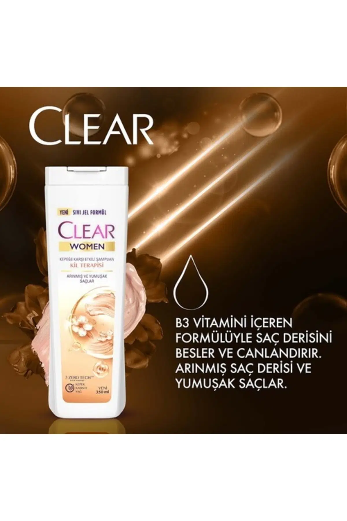 Sağlıklı bir saç için şampuan seçimi ve saç bakımı çok önemlidir. Saçlarınızı ağırlaştırmadan ve kurutmadan dipten uca arındıran clear women kil terapisi arınmış ve yumuşak saçlar kepeğe karşı etkili şampuan, düzenli kullanımla beraber kepek, kepeğe bağlı yağlanma ve kaşıntı sorunlarını önlemeye yardımcı olur*. Şampuanı ıslak saça ve saç derisine uygulayın. En etkili sonuç için saç derisine masaj yaparak uygulayın ve durulayın. Kusursuz, canlı ve hacimli saçlara sahip olmak için her gün kullanın. \nkadın şampuan markaları arasında yerini alan clear’ın kadın şampuan çeşitlerinden clear women kil terapisi arınmış ve yumuşak saçlar kepeğe karşı etkili şampuan, yeni sıvı jel formülü ve 3zerotech teknolojisi ile kepek, kaşıntı ve yağlanma gibi saç derisi problemlerini önlemeye yardımcı olur.* amino asitler, b3 vitamini ve tohum yağı içeren formülüyle saç derisini besler ve canlandırır, arınmış saç derisi ce yumuşak saçlara sahip olmanızı sağlar. Içeriğindeki kil, mineral deposu olarak da bilindiğinden, saçları ağırlaştırmadan ve kurutmadan dipten uca arındırır. Saçlarınıza ipeksi yumuşaklık kazandırır. \n\nsaçlar gün boyunca dış etkenlerden dolayı yağlanır ve ağırlaşır. Bu yağı düzenli olarak saç derisinden arındırmak gerekir. Clear besleyici şampuan kil terapisi arınma ve yumuşaklık zenginleştirilmiş formülü ile saçlarınıza ağırlaştırmadan bakım sağlar. Kuru saça sahip insanların saçı kolayca kırılır ve dökülür. Clear tarafından geliştirilen kadın şampuanı; kil bakımı ile saçları nemlendirerek, yağ dengesini korur. Uzun uzun kadın şampuan önerisi aramaya son! Clear uzmanlığı ile hem beslenmiş saç derisine hem de ipeksi yumuşaklığı ile göz kamaştıran parlak saçlara kavuşmak, bir şampuan kadar yakınınızda. \n\nkullanım: Islak saç ve saç derisine uygulayın, saç derisine masaj yapın ve durulayın. En iyi sonucu almak için her gün kullanın. \n\niçindekiler: Aqua, sodium laureth sulfate, cocamidopropyl betaine, sodium chloride, dimethiconol, dimethicone, parfum, piroctone olamine, phenoxyethanol, carbomer, sodium salicylate, citric acid, guar hydroxypropyltrimonium chloride, sodium hydroxide, mica, tea-Dodecylbenzenesulfonate, glycerin, tea-Sulfate, sodium benzoate, laureth-23, poloxamer 407, helianthus annuus (sunflower) seed oil, laureth-4, niacinamide, glycine, peg-4, xanthan gum, ppg-9, manicouagan clay, geraniol, linalool, cl 77891.