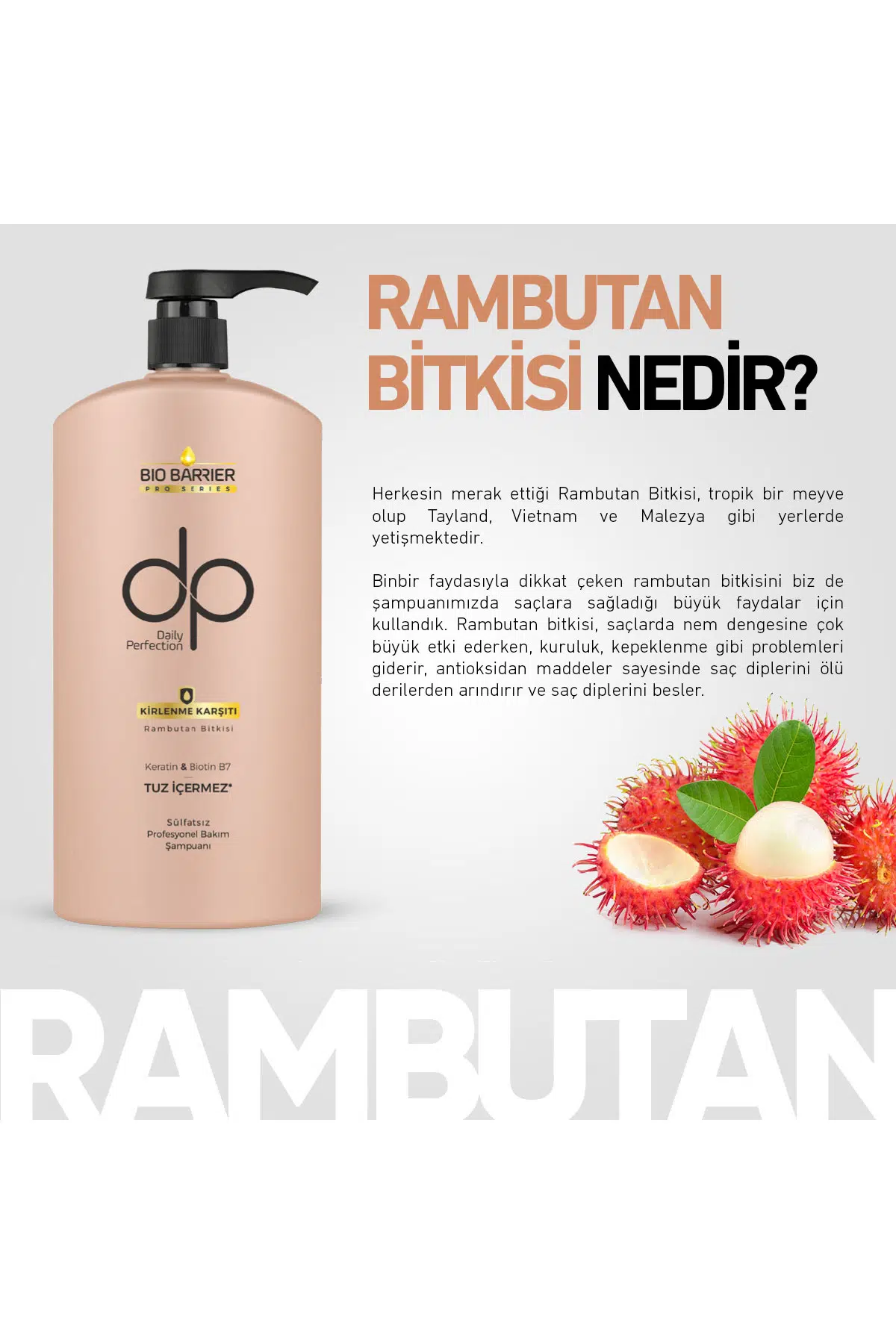 Bio Barrier Etkisi Nedir? • Saç yüzeyinde bariyer oluşturarak koruma kalkanı sağlar. • Saç derisinin rahatlamasını sağlayarak, saçtaki kaşıntı problemini minimuma indirger. • Saçların mat görünümünü engelleyerek daha canlı görünmesini sağlar. Kirlenme Karşıtı • İçeriğindeki %100 doğal rambutan bitkisi ile saçlarınızı çevresel kirlenmelere karşı korur. • Tuz ve sülfat içermeyen özel formülü ile saç derisini ve saçı yıpratmadan temizler. Keratin ve Biotin B7 içerir.