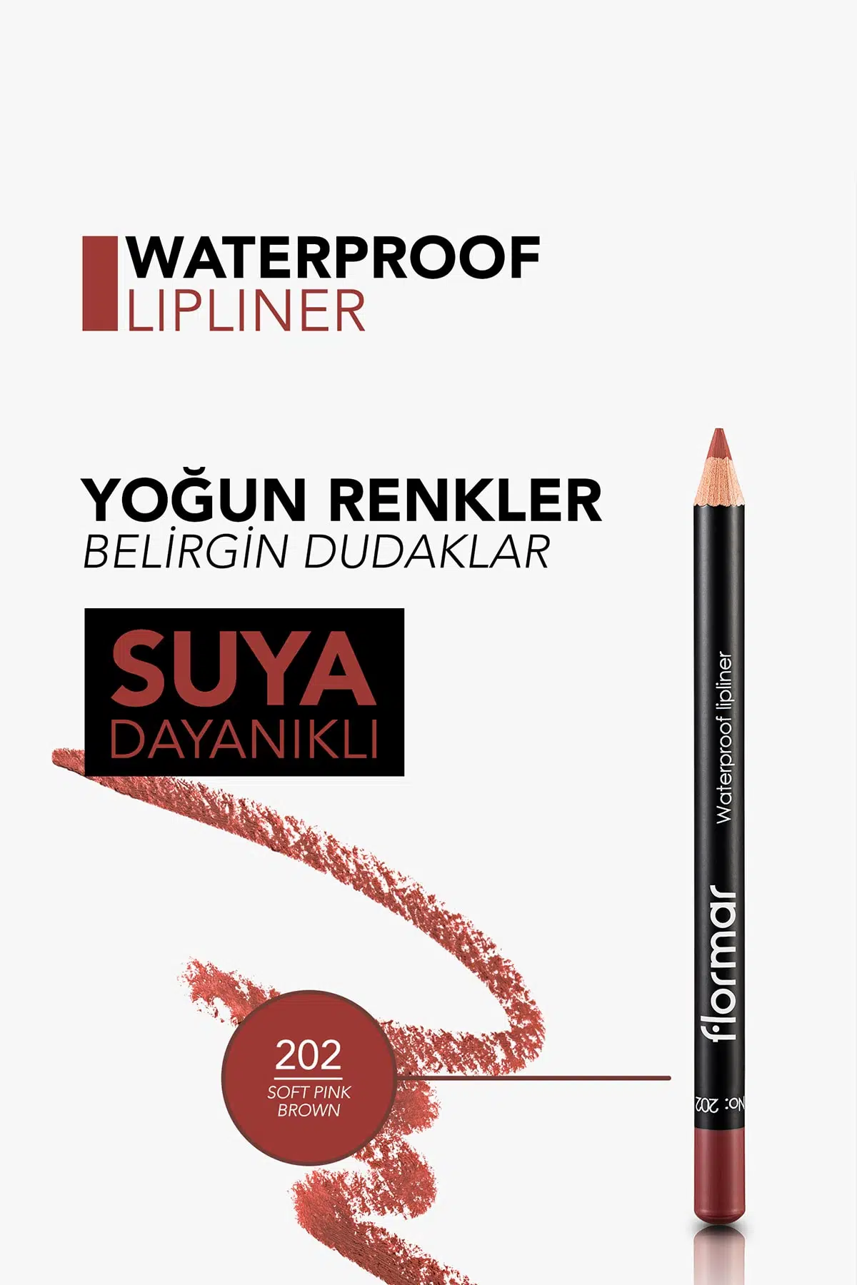 Flormar Suya Dayanıklı Dudak Kalemi (Bordo) 202 Soft Pink Brown, yüksek kalıcılık sunan bir dudak makyajı ürünüdür. Suya dayanıklı formülü sayesinde konforlu bir kullanım sunar. Flormar Waterproof Lipliner, ruj uygulamalarını daha kusursuz hale getirmeye ve dudakların çekiciliğini artırmaya yardımcı olur. 202 Soft Pink Brown olarak adlandırılan bordo rengiyle çarpıcı ve estetik bir görünüm sağlar. Flormar bordo dudak kalemi, mat bitişli yapısı sayesinde doğal bir görünüm sergiler. Suya dayanıklı formülü sayesinde havuzda ve denizde rahatlıkla kullanılabilen bu dudak kalemi, akma ve dağılma yapmaz. Gün içinde konforlu bir kullanım sağlar. Dudak makyajını tazeleme derdini ortadan kaldırır. Flormar waterproof dudak kalemi, dudak çerçevesini belirginleştirerek rujun bulaşmadan uygulanmasına imkan verir. Flormar mat bitişli dudak kalemi, yumuşak uç tasarımıyla konforlu uygulama yapmaya yardımcı olur. İpeksi yapısı sayesinde dudaklarda kolayca uygulanır. Flormar dağılmayan dudak kaleminin dudakların ortasından kenarlarına doğru uygulanması önerilmektedir. Ruj uygulamalarından önce kullanılabileceği gibi tek başına da kullanılabilir.