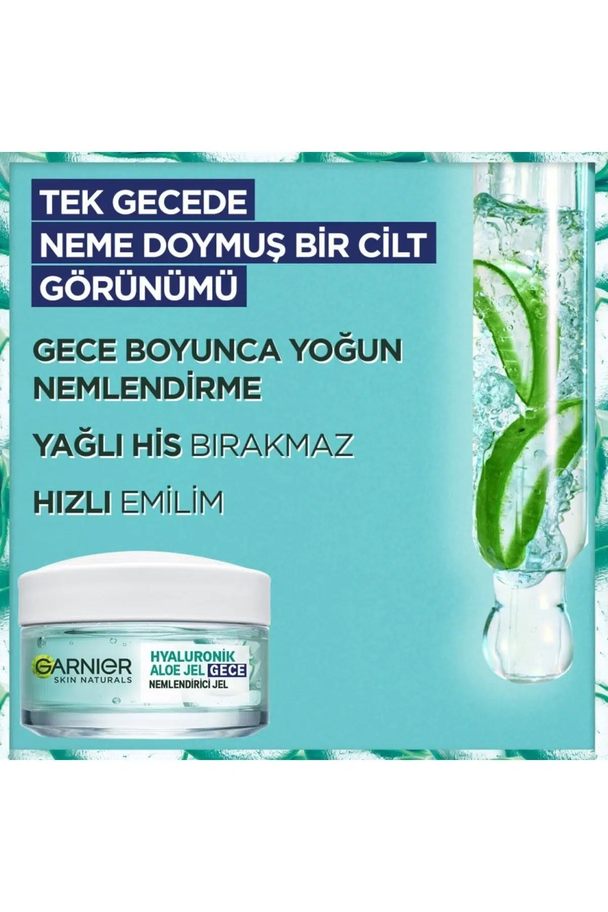 %98 doğal kaynaklı içeriklere sahip Hyaluronik Aloe Jel Gece, Hyaluronik Asit ve Argan Yağı içeren formülü sayesinde cildinizi 48saat boyunca nemlendirir.Rahatlatıcı jel dokusu sayesinde dinlenmiş görünen bir cilt görünümü elde etmenizi sağlar.Organik Aloe Vera özü içeren formülü sayesinde cildinizi yatıştırır ve yoğun şekilde nemlendirir.Biyofermantasyon ile elde edilen Hyaluronik Asit (x2)*** içerir.Sudaki ağırlığının 1000 katına kadar nemi cilde hapsetme özelliğiyle bilinen hyaluronik asit içeren formülü sayesinde nemi cilde hapseder.Argan özü içeren formülü sayesinde daha esnek ve yumuşak bir cilt elde etmenize yardımcı olur.