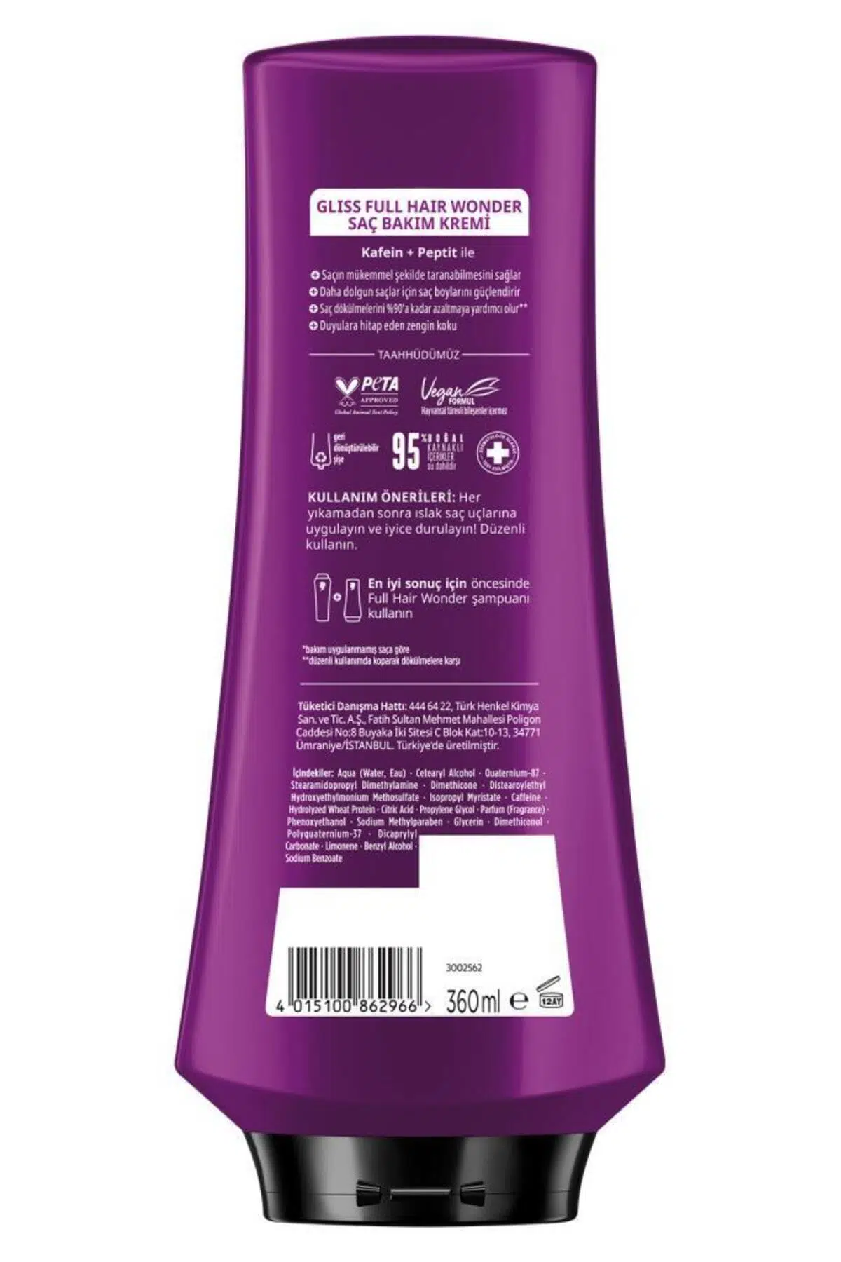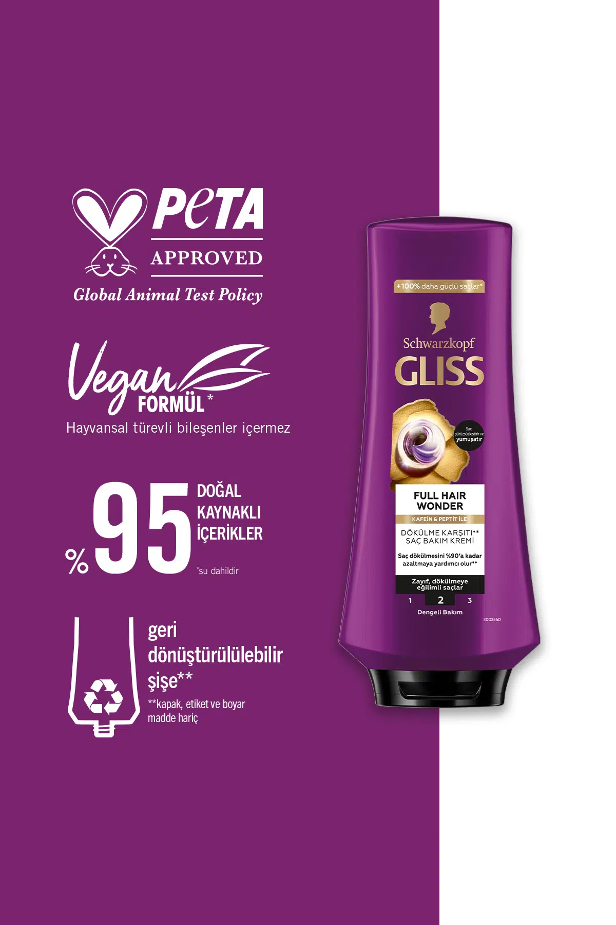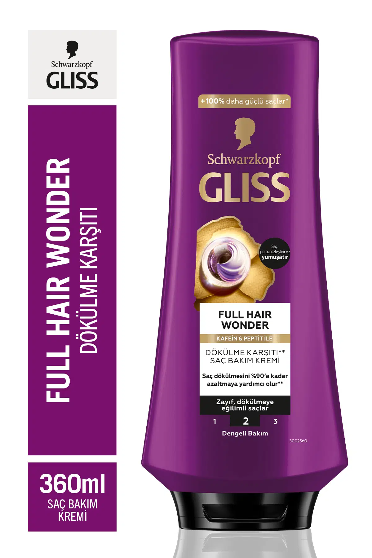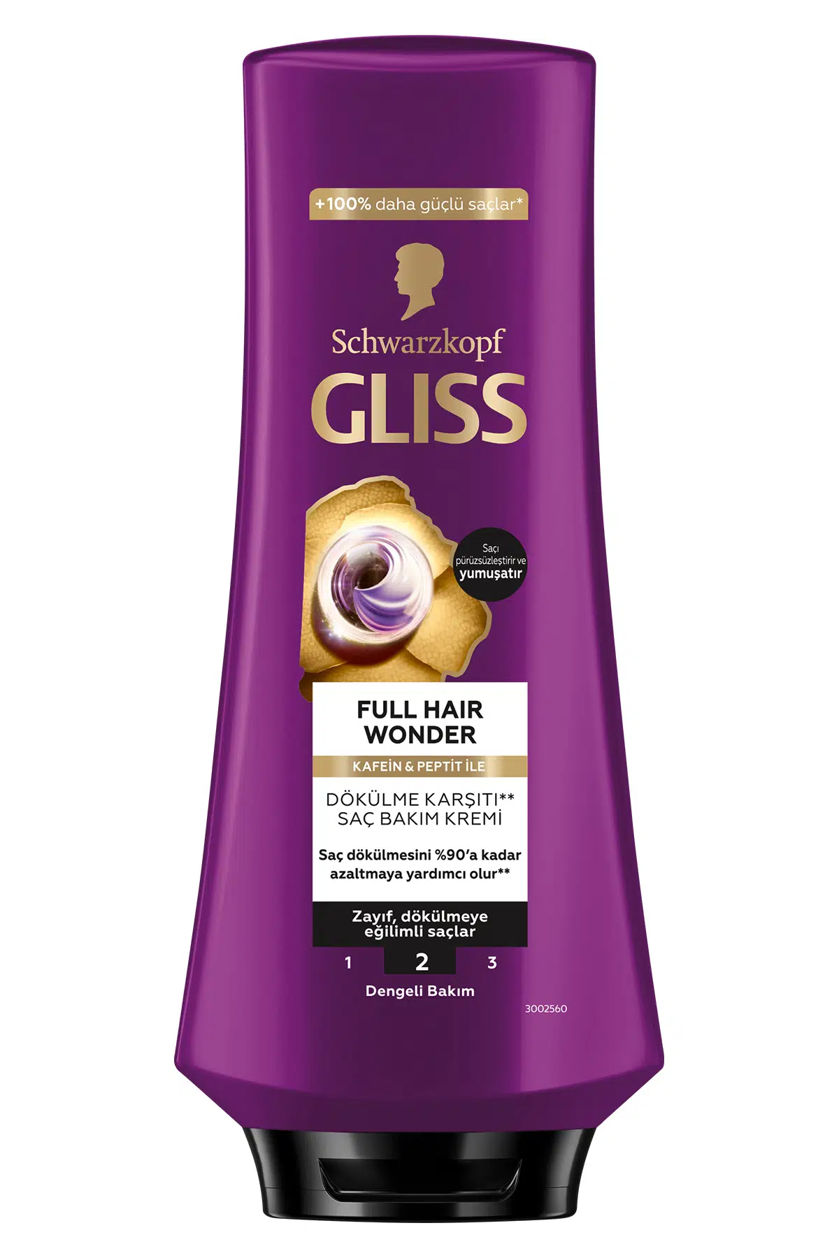Gliss Full Hair Wonder Dökülme Karşıtı Saç Bakım Kremi, zayıf ve dökülmeye eğilimli saçlar için geliştirilmiş Kafein ve Peptit içeren formülü ile %90'a kadar azaltmaya yardımcı olur*.