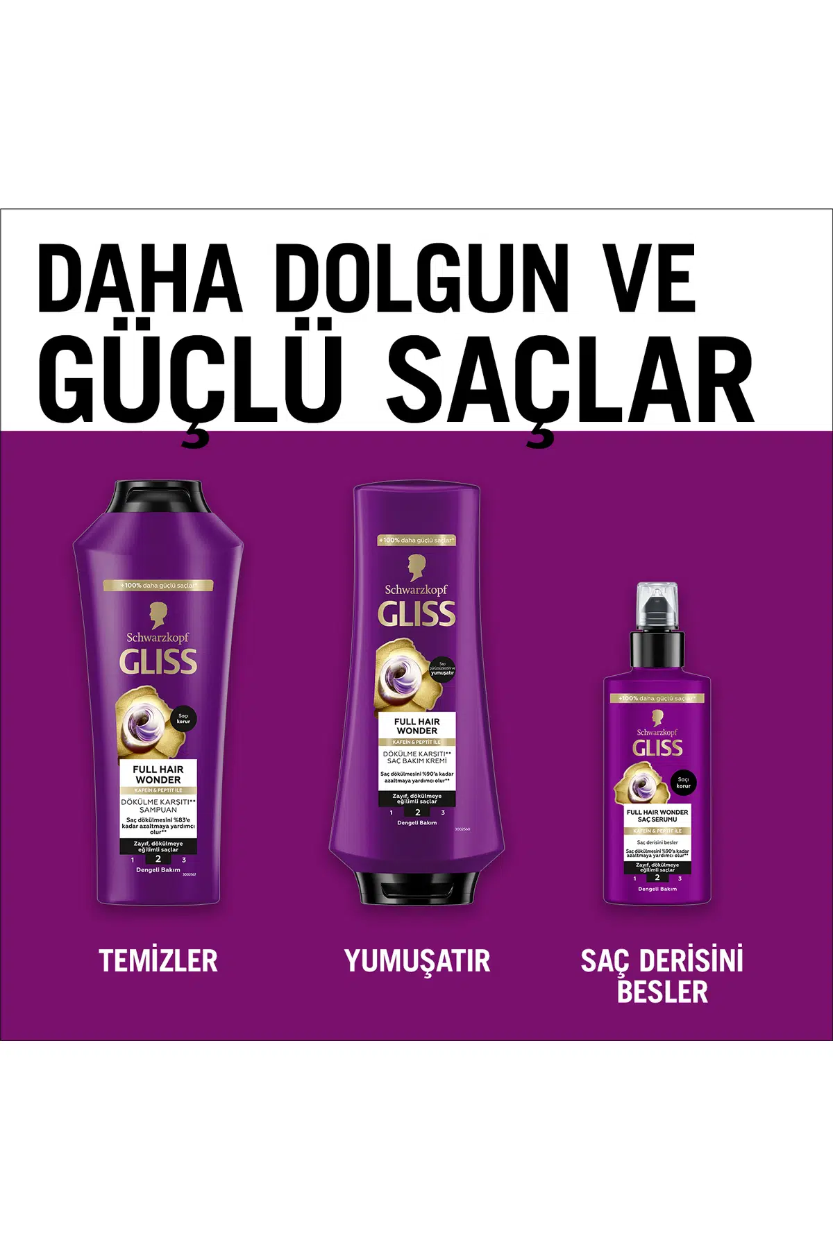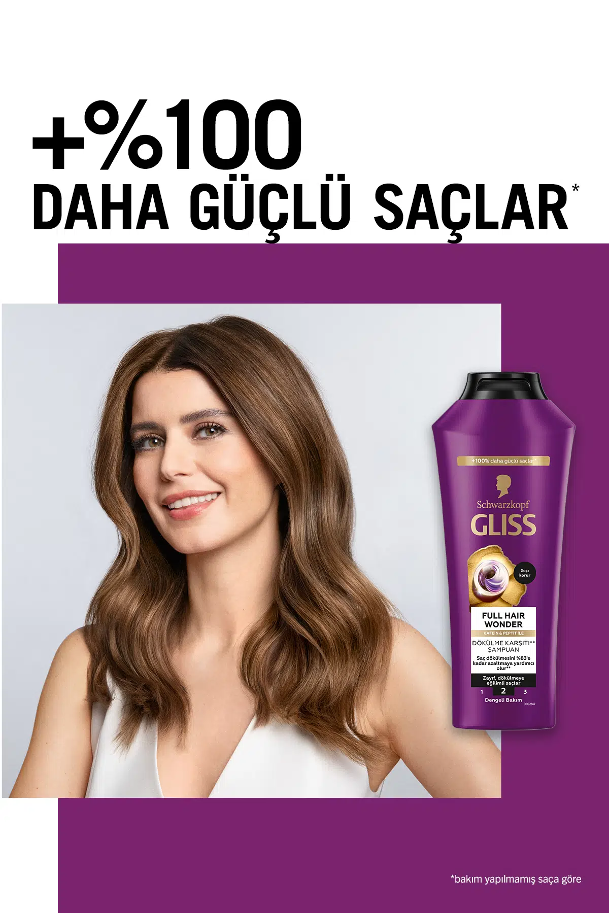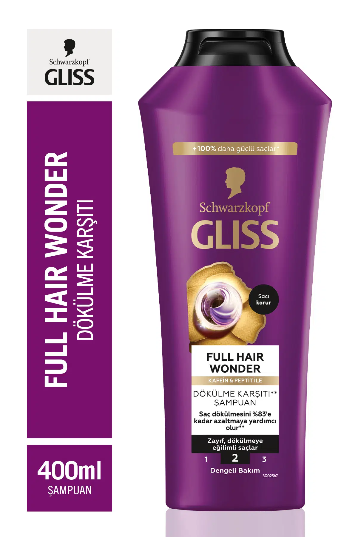 Gliss Full Hair Wonder Şampuan, zayıf ve dökülmeye eğilimli saçlar için geliştirilmiş Kafein ve Peptit içeren formülü ile %83'e kadar azaltmaya yardımcı olur*.