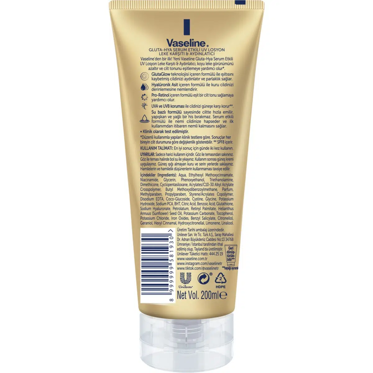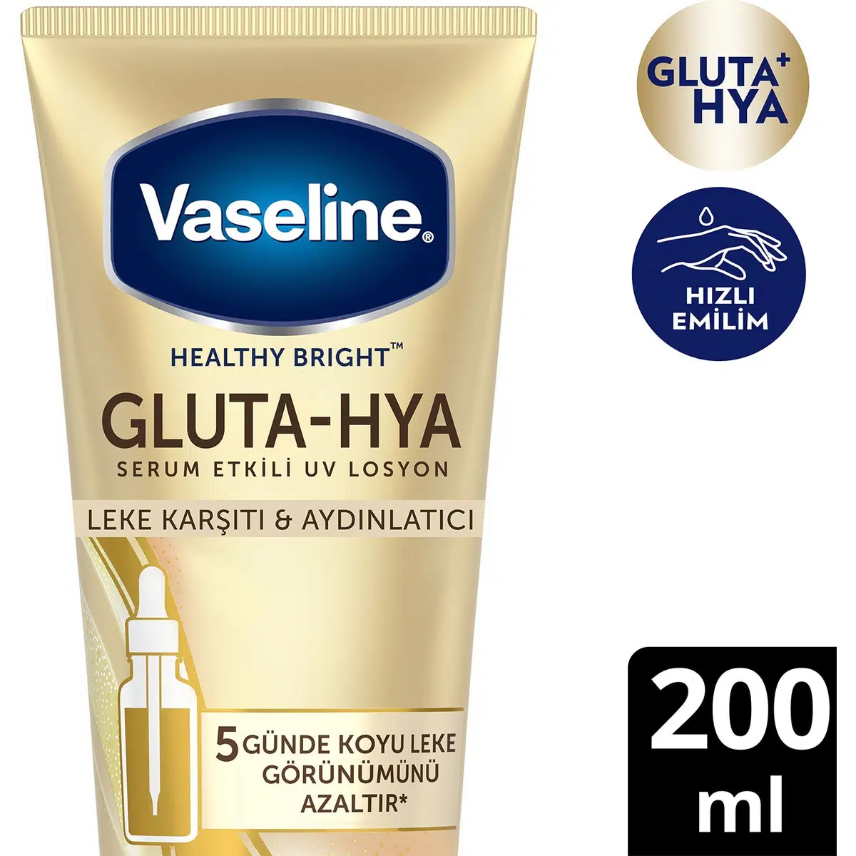 Vaseline Gluta-Hya Serum Etkili Losyon Canlandırıcı Parlaklık şimdi Türkiye’de! Özel formülü sayesinde sadece 5 GÜNDE daha aydınlık ve parlak bir cilt*! El ve vücut bakım rutininizi yenileyecek ve güzelliğinize taze bir soluk getirecek bu muhteşem ürün, bakım alışkanlıklarınızın vazgeçilmez bir parçası olacak. Adını GlutaGlow teknolojisi ve Hyalüronik Asit'ten alan Vaseline Gluta-Hya serisi, GlutaGlow içeren özel formülü ile ışıltısını kaybetmiş cildinizi canlandırır ve ona muhteşem bir parlaklık kazandırır. Formülündeki Hyalüronik Asit ile cildinizi derinlemesine nemlendirir ve ipeksi bir yumuşaklık sağlar. Vaseline Gluta-Hya Serum Etkili Losyon Canlandırıcı Parlaklık, yüz bakımının en sevilen içeriklerinden Niasinamid ile zenginleştirilmiştir. Cilt sağlığınızı desteklemeye yardımcı olan Niasinamid, cildinizin doğal aydınlığını artırır, daha parlak ve ışıl ışıl bir görünüm kazandırır. Gluta-Hya Serum Etkili Losyon Canlandırıcı Parlaklık, cildinize ışıltı ve parlaklık katma konusunda mükemmel bir seçenektir. Su bazlı formülü sayesinde uygulandığı bölgede hızla emilen Vaseline Gluta-Hya Serum Etkili Losyon, yağlı ve yapışkan bir his bırakmaz. Serum etkili formülü ile nemi cildinize hapseder ve ilk kullanımdan itibaren cildinizin nemli kalmasını sağlar. Dermatolojik olarak test edilmiştir. İçindekiler: Aqua, Dimethicone, Isohexadecane, Glycerin, Niacinamide, Carbomer, Phenoxyethanol, Parfum, Methylparaben, Sodium Hydroxide, Acrylates/C10-30 Alkyl Acrylate Crosspolymer, Disodium EDTA, Titanium Dioxide, Cystine, Glycine, Sodium PCA, Glutathione, Sodium Hyaluronate, Petrolatum, Tocopherol, BHT, Citronellol, Hexyl Cinnamal, Limonene, Linalool.