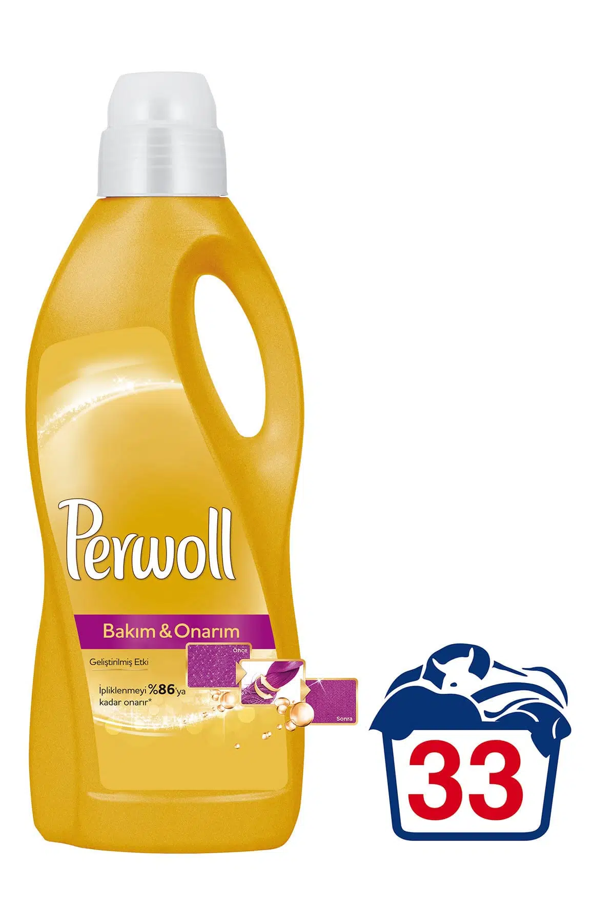 Perwoll Bakım ve Onarım 33 Yıkama ürünü, Perwoll'ün onarıcı etkili formülü sayesinde giysilerinizin ilk günkü gibi kalmasına, sıradan deterjanların yıpratıcı etkisinin silinmesine olanak sağlar. Geliştirilmiş yenileme özelliğine sahip Perwoll Bakım ve Onarım 33 Yıkama çamaşır deterjanı sayesinde renkler canlılığını kaybetmez, su ve deterjan sebepli pürüzlü hale gelen kumaş dokuları onarım görür.