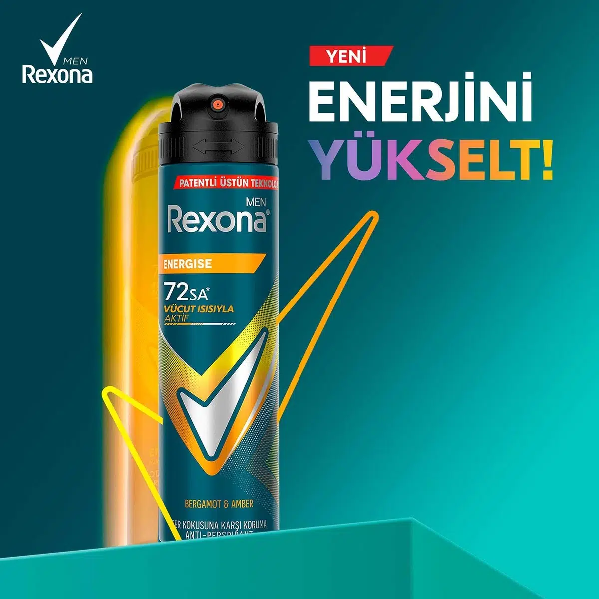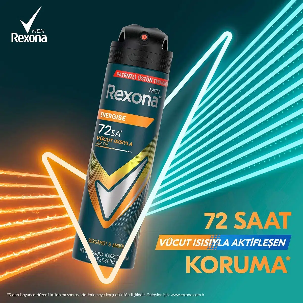 YENİ Rexona Men Energise Antiperspirant Aerosol Deodorant ile Enerjini Yükselt! YENİ Rexona Men Energise Antiperspirant Deodorant, en yoğun çalışmalarınızda veya en stresli anlarınızda bile ihtiyacınız olan kuruluk hissini size sunarak özgür hissetmenize yardımcı olur. Bedeninize uyum sağlayan özel VÜCUT ISISIYLA AKTİFLEŞEN KORUMA teknolojisi ile geliştirilen bu deodorant, ter ve kötü kokuya karşı 72 saat koruma* sağlayarak en hareketli günlerinizde bile ferahlık hissini korumanıza yardımcı olur. Her an duştan yeni çıkmış gibi temiz hissetmenizi sağlar. Ter ve terlemeden kaynaklı oluşan kötü kokuların sizi durdurmasına izin vermez.