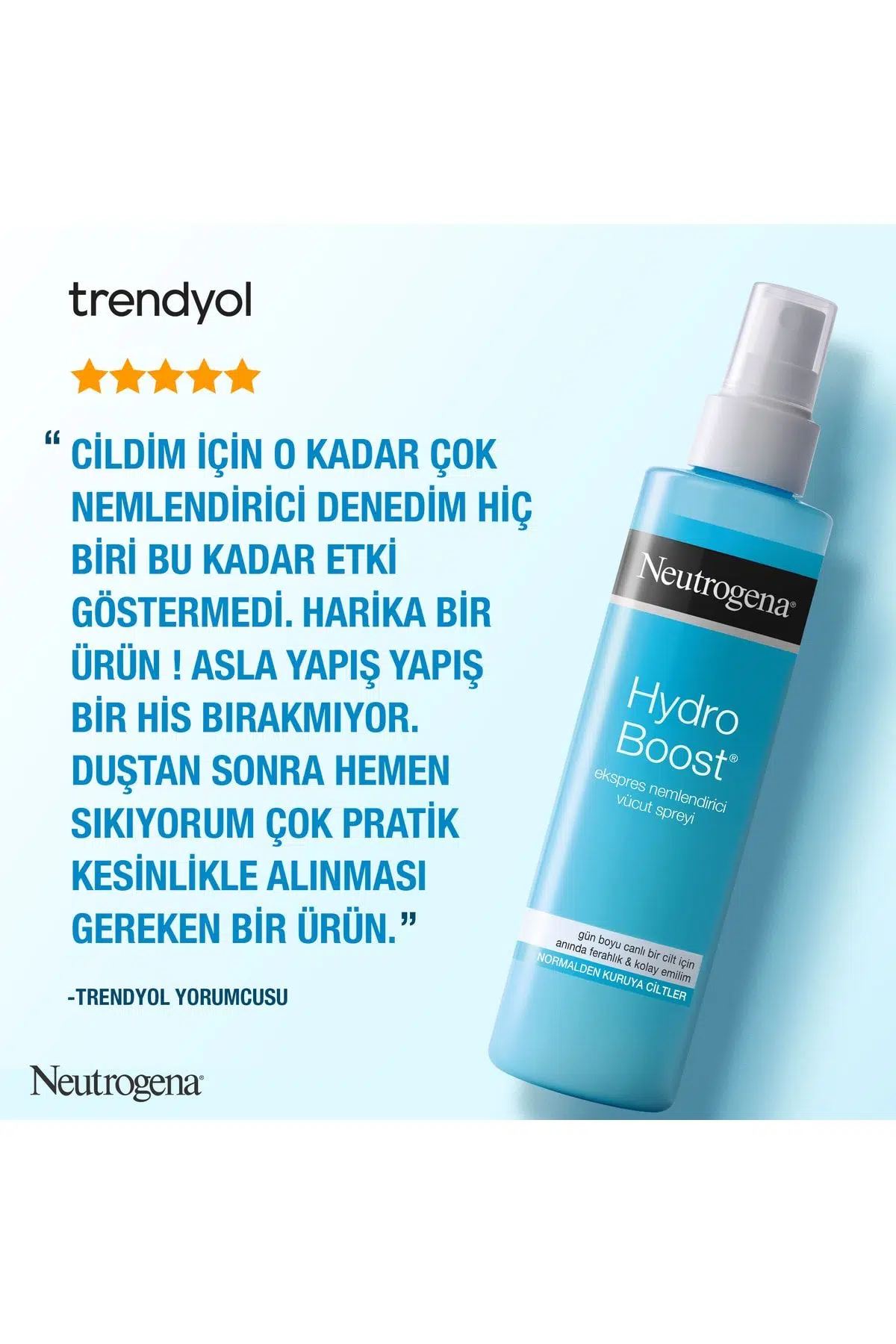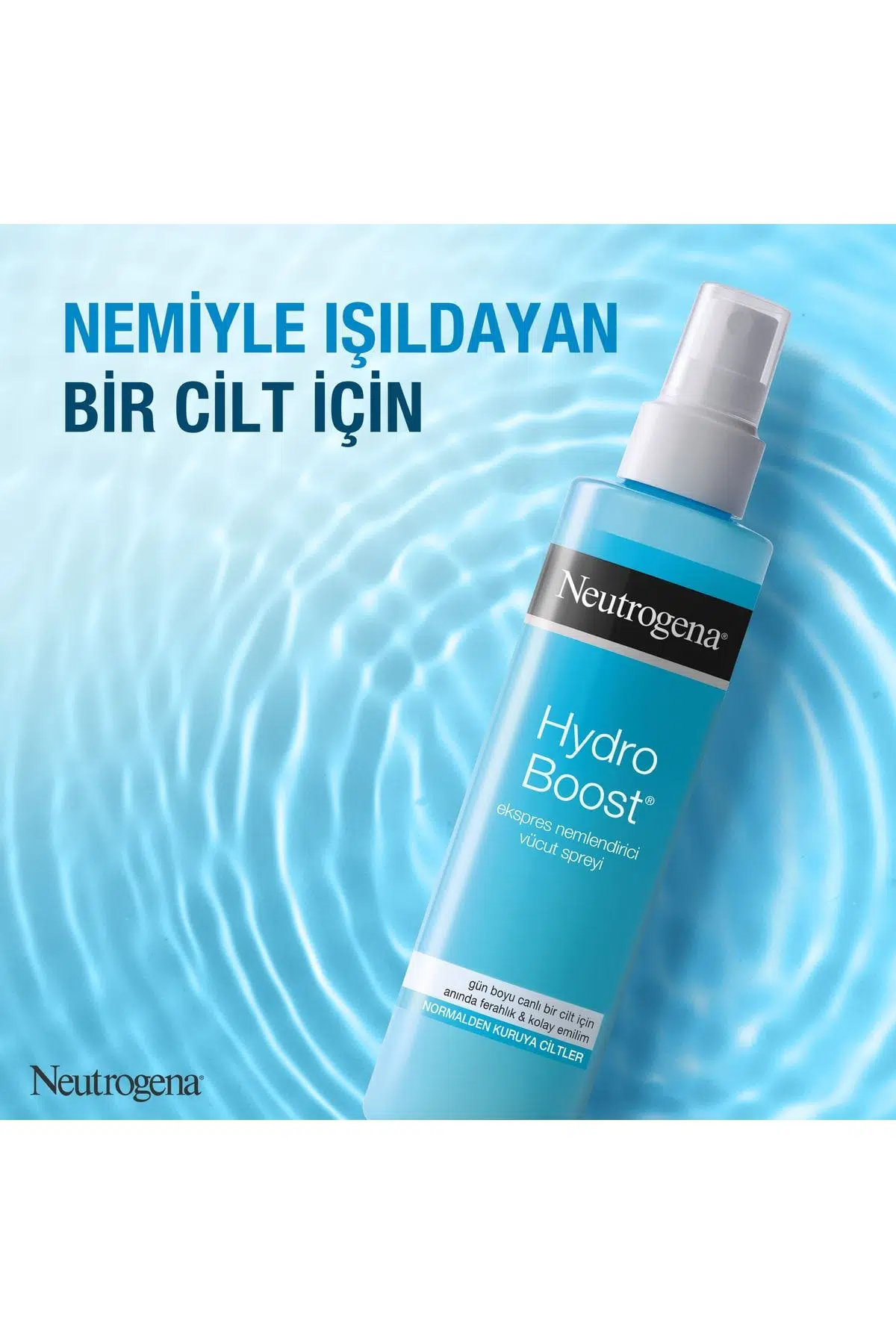 Neutrogena® Hydro Boost® Ekspres Nemlendirici Sprey Faydaları Yeni Neutrogena® Hydro Boost® Ekspres Nemlendirici Sprey gün boyu sıkı ve canlı bir cilt için anında nemlendirir. Bu ferahlatıcı, ultra hafif, ferahlatıcı ve serinletici formül kendi ağırlığının 1000 katı kadar su tutabilen Hiyalüronik Asit içeriği sayesinde cildinizde yoğun bir nemlendirme sağlar. Neutrogena® Hydro Boost® Ekspres Nemlendirici Sprey Özellikleri Cildin nem ihtiyacını iki adımda karşılar: Cilde nemi hapseder Ve cildiniz ihtiyaç duydukça ona geri vererek nem dengesini sağlar Neutrogena® Hydro Boost® Ekspres Nemlendirici Sprey Sonuçları Kadınların %79’u cildini fark edilir şekilde pürüzsüz hissetmektedir. Kadınların %74’ü cildinin gün boyu güzel göründüğünü hissetmektedir. Duş veya banyo sonrası doğrudan ıslak cildinize uygulayarak suyu cildinize hapsedin. Yağsız ve yapışkan olmayan formülü cilde anında nüfuz ederek kolayca emilir. Böylece uygulamadan sonra giyinmek için beklemenize gerek kalmaz. Yoğun nemlendirici bir etki için cildinize yakın püskürtürken ferahlatıcı bir etki için uzaktan püskürtün. Hassas ciltler için uygundur. Dermatolojik kontrol altında test edilmiştir. Hydro Boost® serisinin el, vücut ve yüz ürünlerini keşfederek günlük bakımınızın her adımında nemlendirmenin keyfini sürün. *160 gönüllünün, 1 hafta boyunca günde bir defa kullanımı ile, tüketici çalışması