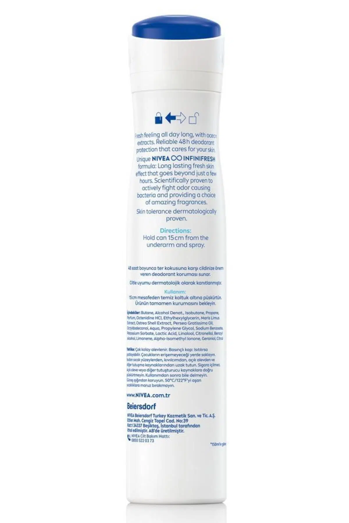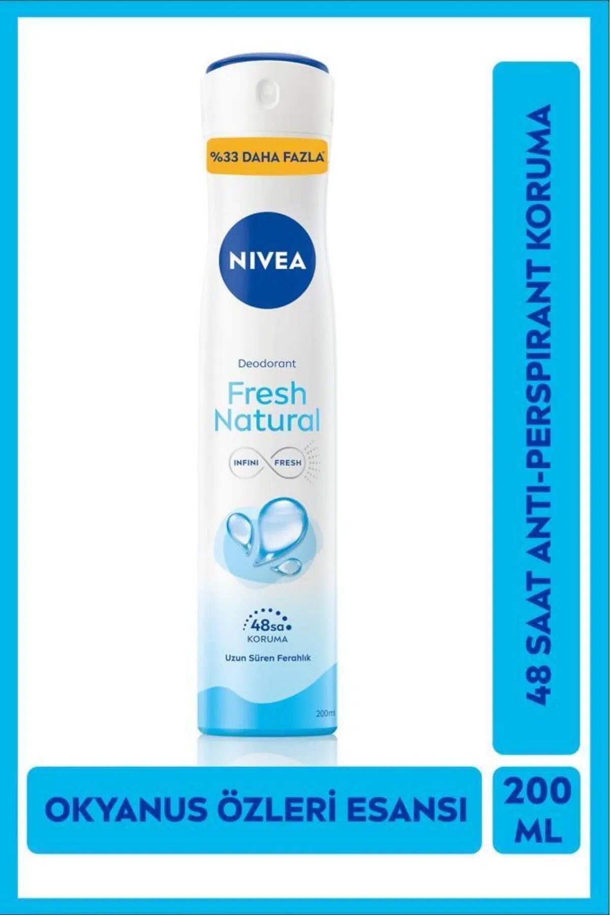 Türkiye'nin Lider Deodorantı NIVEA'dan NIVEA Kadın Sprey Deodorant Fresh Natural, okyanus özleri içeren formülü ile gün boyu süren ferahlık hissi verir. ; 48 Saat Deodorant koruması: Ter ve ter kokusuna karşı cildinize önem veren 48 saate kadar etkili deodorant koruması sağlar. ; Özellikle aerosol spreylerin içeriğinde bulunan sıkıştırılmış gazlardan rahatsız olan kullanıcılar için idealdir. ; Gün boyu güvenilir koruma ve doğal tazelik sağlar. ; Ciltle uyumu dermatolojik olarak kanıtlanmıştır. ; Alkol ve boya maddesi içermez. ; %0 Aluminyum. ; NIVEA Fresh Natural kadın deodorant 4 farklı formatta mevcuttur: Kadın sprey deodorant,kadın roll on deodorant, kadın stick deodorant ve kadın pump sprey deodorant. ; NIVEA Fresh Natural deodorant : Kişisel bakım rutininizin vazgeçilmezi! NIVEA Bakım Güvencemiz: EN yüksek kalite standartlarına sahip içerikleri seçiyoruz. ;