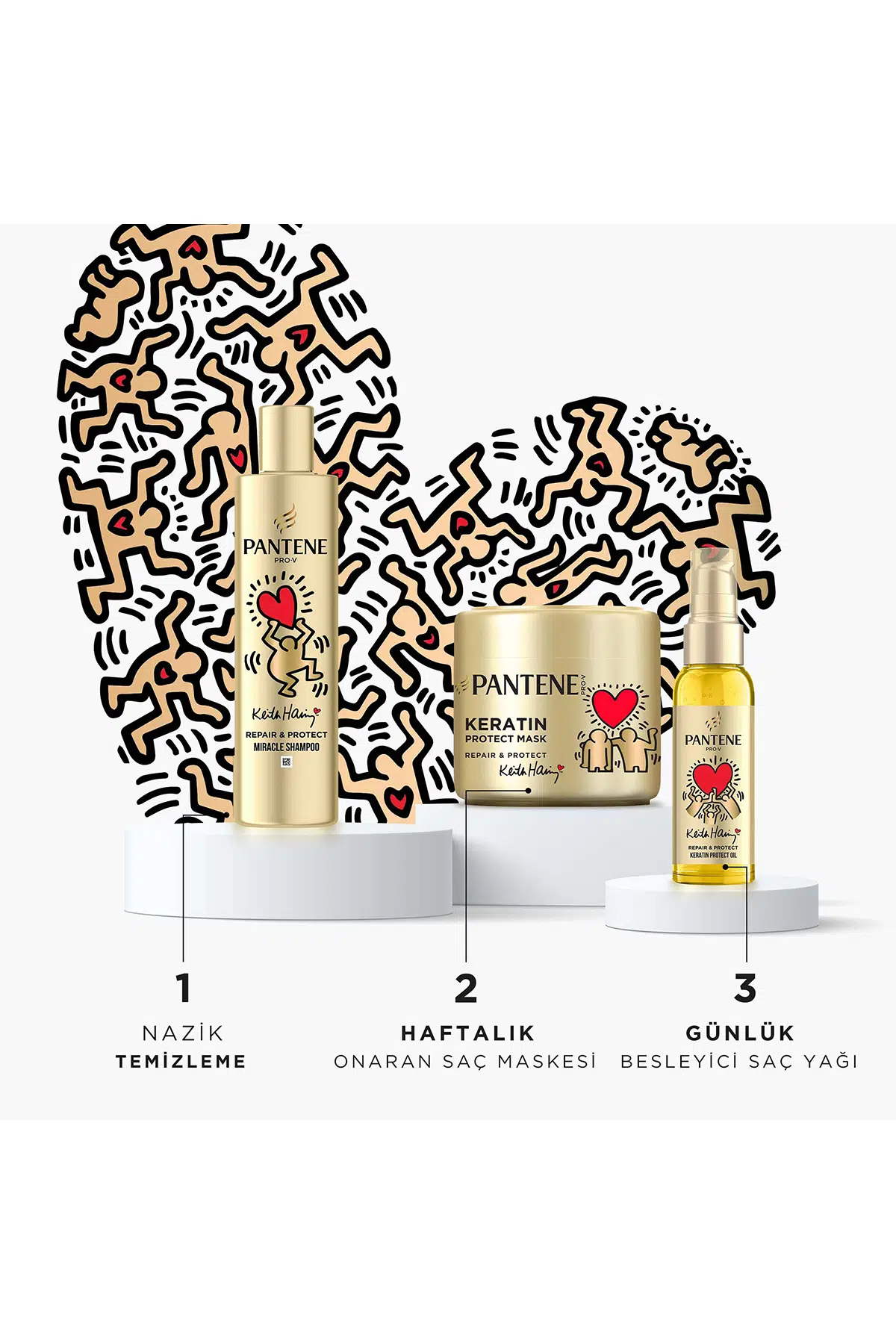 Pantene x Keith Haring Artist Edition: Saçlarınızı sevgiyle sarıp sarmalayarak gücünüzü ortaya çıkarın! Saçlarınızı en üst düzeyde onarıp* iyileştiren Pantene Onarıcı & Koruyucu Keratin Koruyucu Saç Yağını keşfedin.