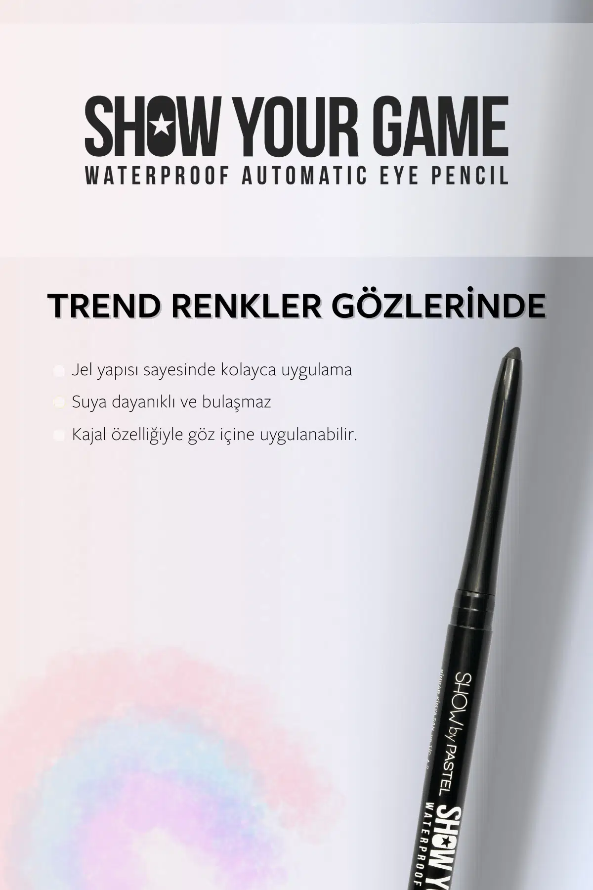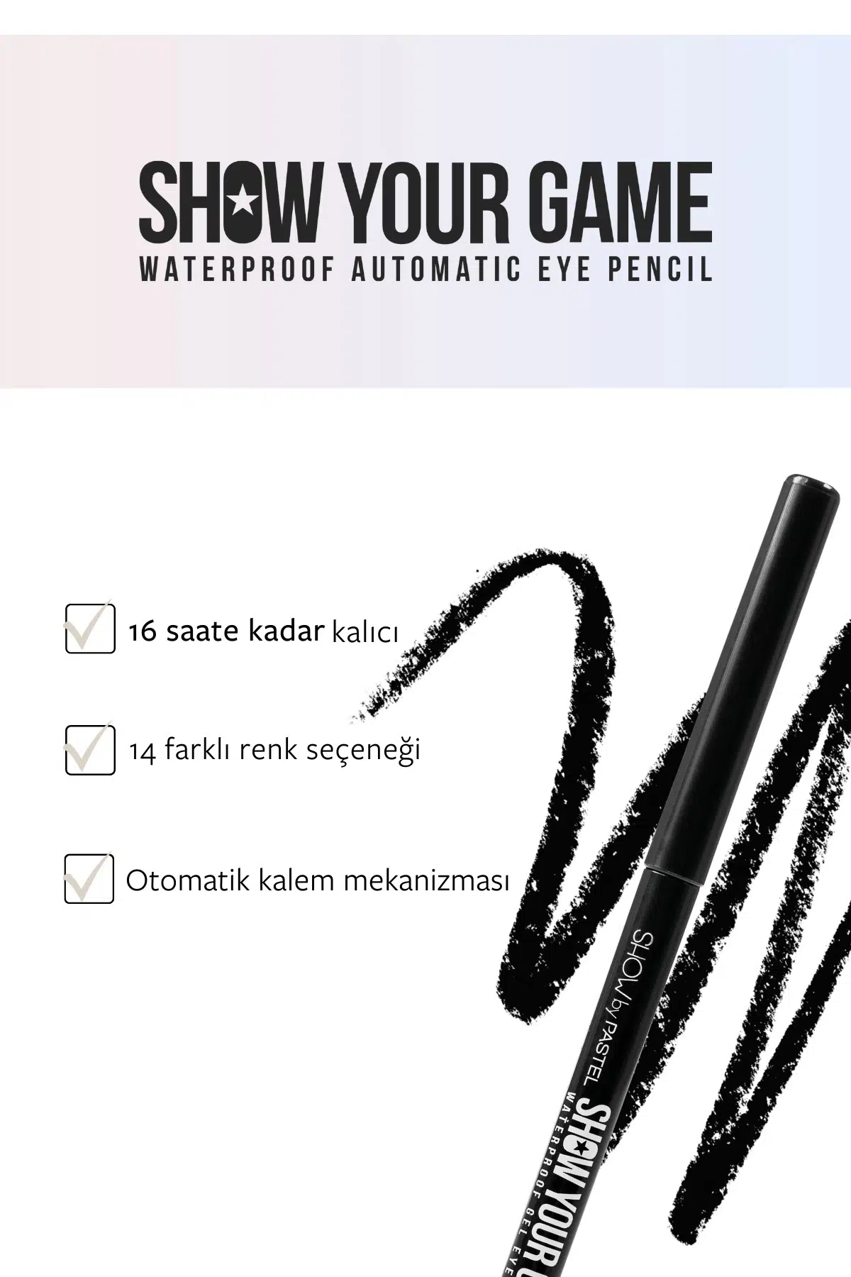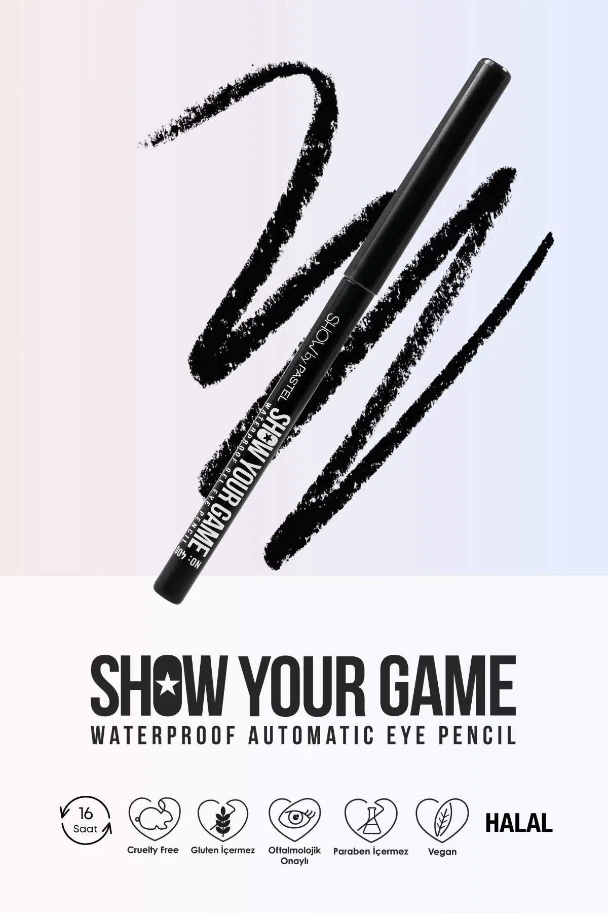 Muhteşem bakışlar yaratmanın pratik yolu Show Your Game göz kalemleri ile fark yaratın!Jel yapısı sayesinde kolay uygulama imkanı sunan Show Your Game göz kalemi, waterproof özelliğiyle 16 saate kadar kalıcıdır, bulaşmaz. Kajal özelliği ile gözünüzün içine de uygulanabilirken otomatik kalem mekanizması sayesinde kalemtıraşa gerek kalmadan pratik kullanım sunar. Vegan, cruelty free, gluten free, paraben free, oftalmolojik onaylı ve helal sertifikalıdır. 0,28 g