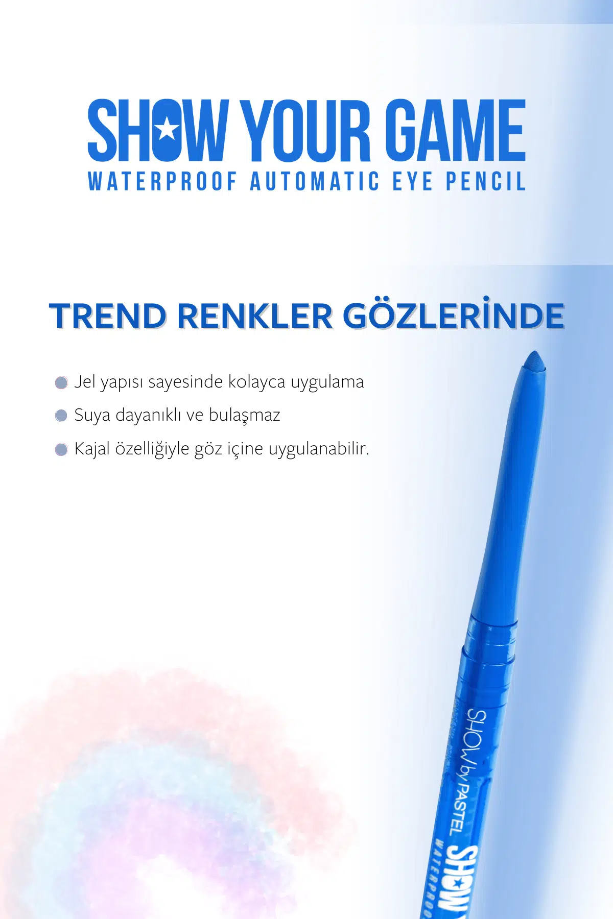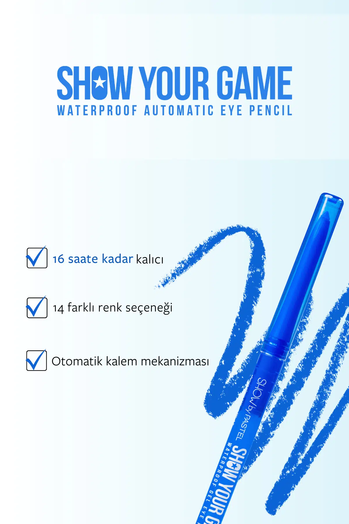 Muhteşem bakışlar yaratmanın pratik yolu Show Your Game göz kalemleri ile fark yaratın!Jel yapısı sayesinde kolay uygulama imkanı sunan Show Your Game göz kalemi, waterproof özelliğiyle 16 saate kadar kalıcıdır, bulaşmaz. Kajal özelliği ile gözünüzün içine de uygulanabilirken otomatik kalem mekanizması sayesinde kalemtıraşa gerek kalmadan pratik kullanım sunar.;Vegan, cruelty free, gluten free, paraben free, oftalmolojik onaylı ve helal sertifikalıdır.;0,28 g