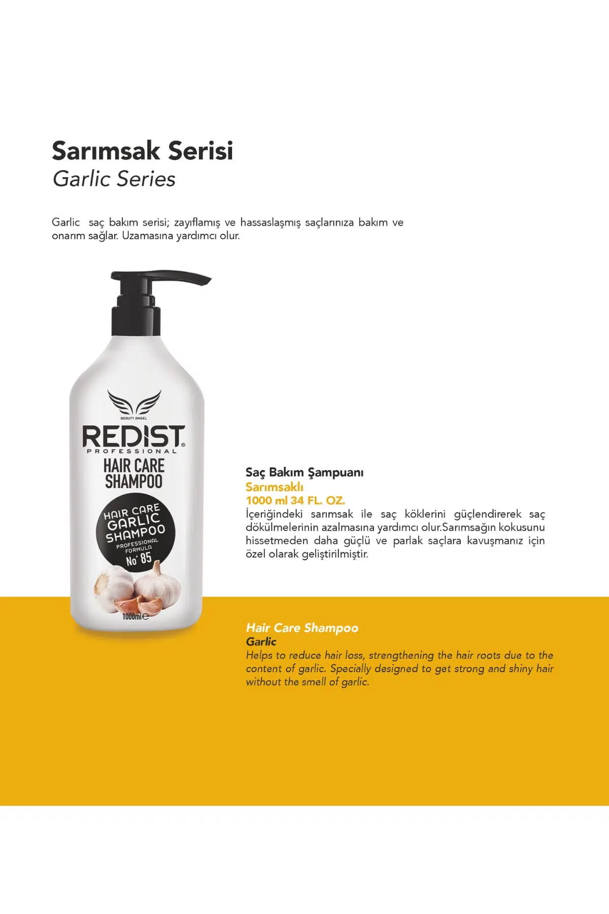 Saç Bakım Şampuanı Sarımsaklı 1000 ml 34 FL. OZ. İçeriğindeki sarımsak ile saç köklerini güçlendirerek saç dökülmelerinin azalmasına yardımcı olur.Sarımsağın kokusunu hissetmeden daha güçlü ve parlak saçlara kavuşmanız için özel olarak geliştirilmiştir. Hair Care Shampoo Garlic Helps to reduce hair loss, strengthening the hair roots due to the content of garlic. Specially designed to get strong and shiny hair without the smell of garlic.