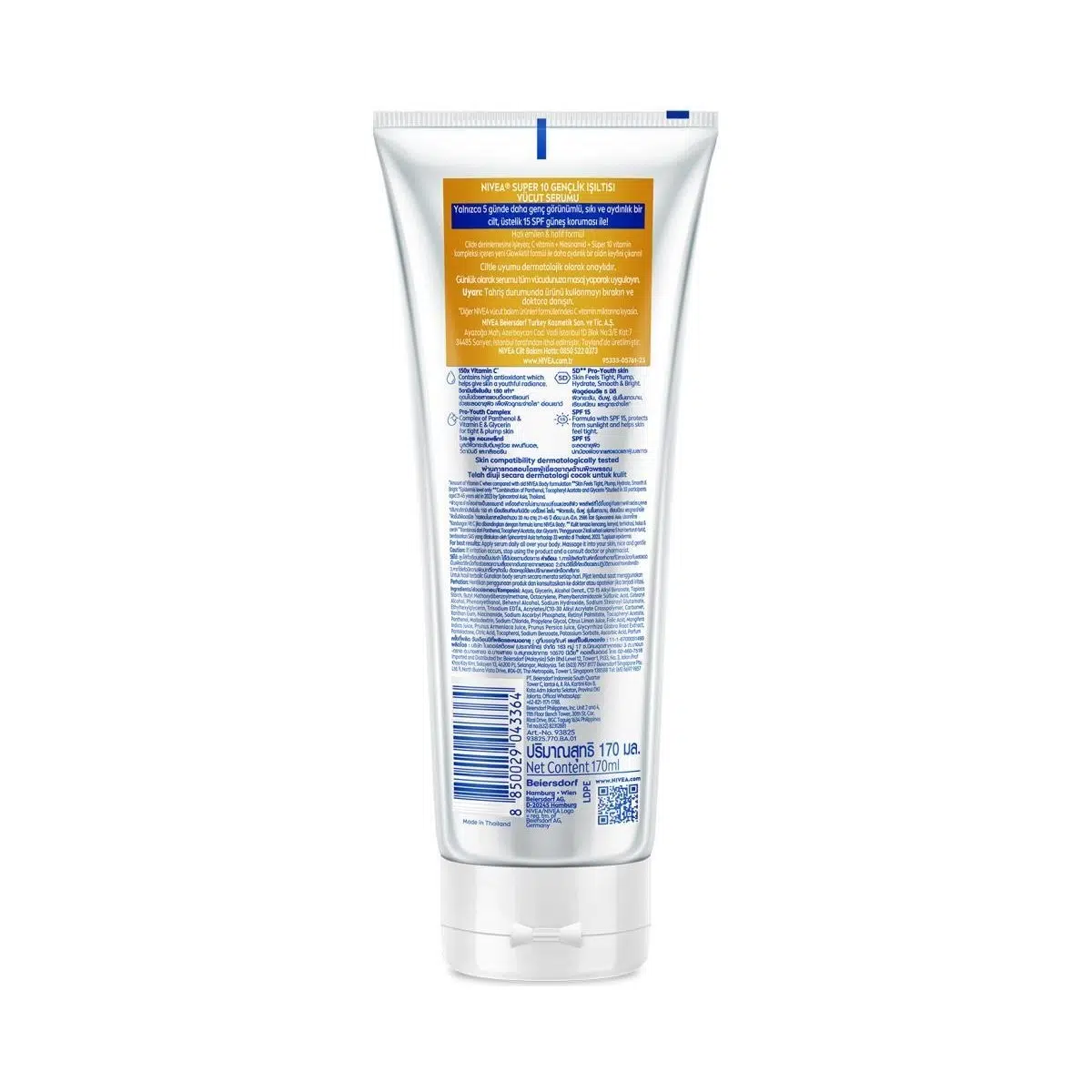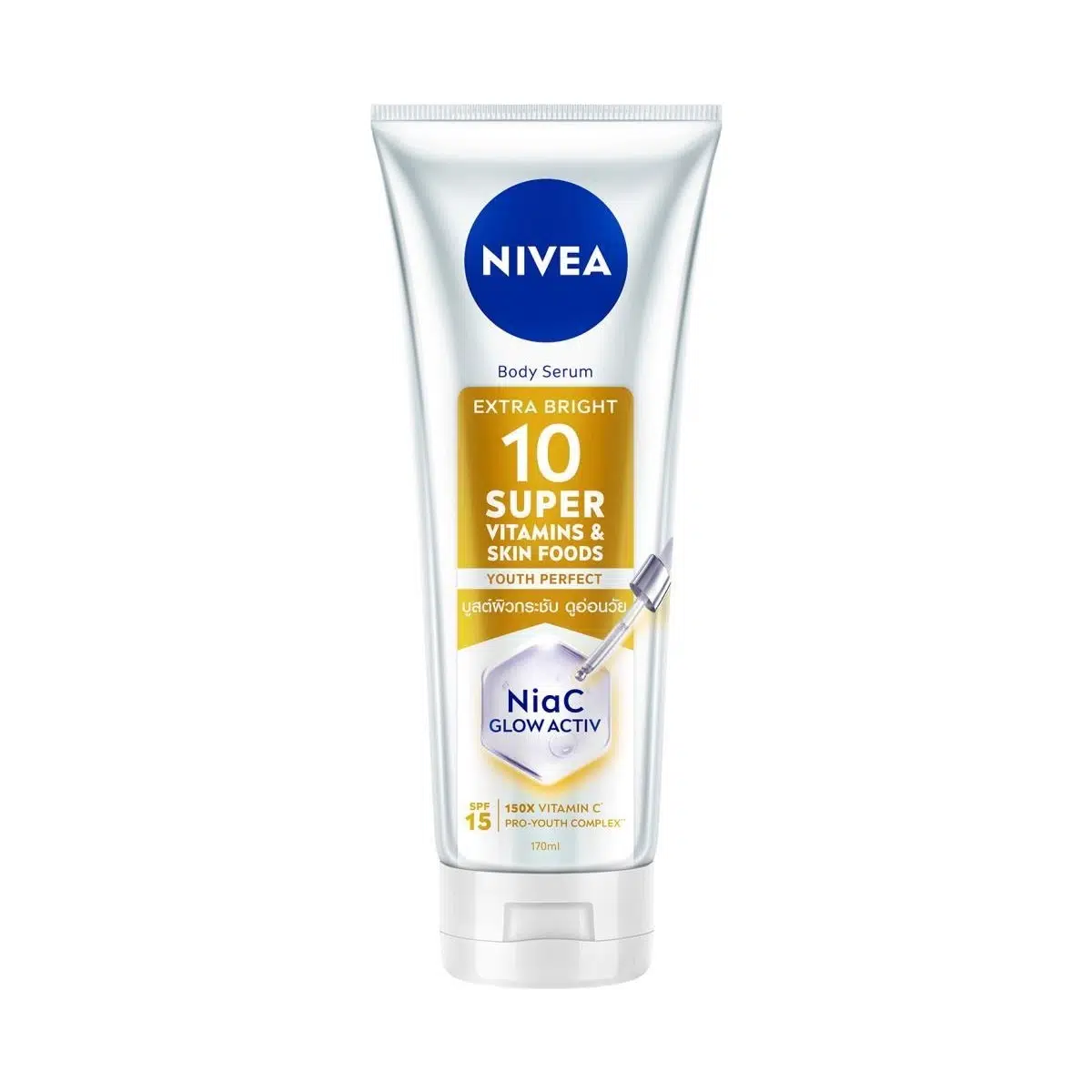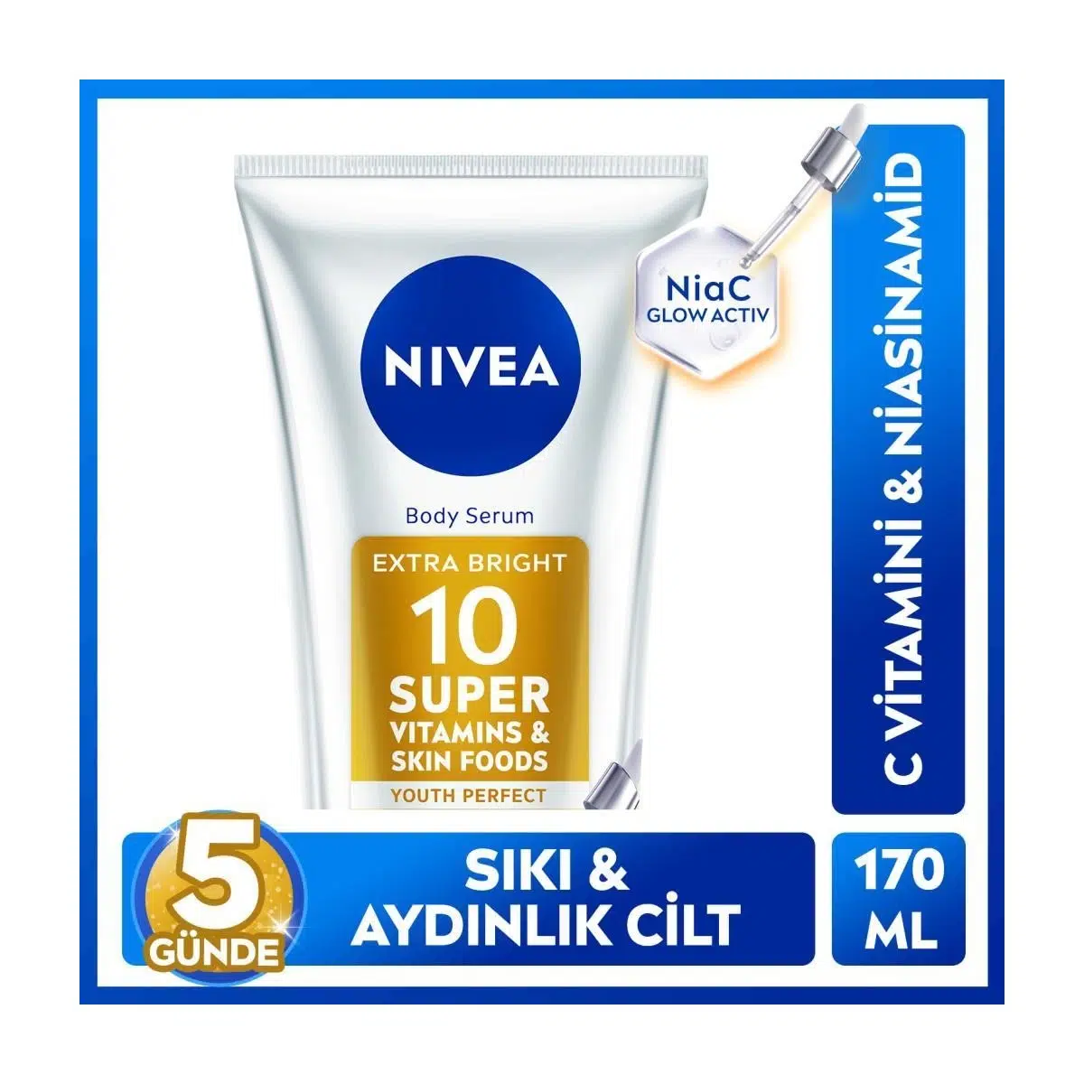 •110 Yıllık cilt bakım uzmanı NIVEA’dan Super 10 Mükemmel Aydınlık Vücut Serumu! • FAYDA: SPF15 güneş koruması ile 5 günde daha ışıtlılı, parlak ve aydınlık bir cilt sağlar. • İÇERİK: C Vitamini, Niasinamid ve Super 10 vitamin kompleksi içeren yeni Glowaktif formülü ile daha aydınlık bir cilt sapğlar. • FORMÜL: Hızlı emilen ve hafif formüle sahiptir. • CİLT TİPİ: Tüm cilt tipleri için uygundur. • UYGULAMA: Günlük olarak serumu tüm vücudunuza masaj yaparak uygulayın. • Tahriş durumunda ürünü kullanmayı bırakın ve doktora ulaşın. • Ciltle uyumu dermatolojik olarak onaylıdır. • NIVEA tarafından 1 adet 170 ml olarak gönderilecektir. • İÇERİK LİSTESİ: Aqua, Glycerin, Alcohol Denat., C12-15 Alkyl Benzoate, Tapioca Starch, Phenylbenzimidazole Sulfonic Acid, Phenoxyethanol, Behenyl Alcohol, Sodium Hydroxide, Sodium Stearoyl Glutamate, Ethylhexylglycerin, Trisodium EDTA, Carbomer, Xanthan Gum, Niacinamide, Sodium Ascorbyl Phosphate, Persea Gratissima Oil, Retinyl Palmitate, Tocopheryl Acetate, Panthenol, Maltodextrin, Sodium Chloride, Citrus Limon Juice, Folic Acid, Lycium Barbarum Fruit Extract, Punica Granatum Fruit Extract, Glycyrrhiza Glabra Root Extract, Pantolactone, Potassium Sorbate, Citric Acid, Tocopherol, Sorbic Acid, Ascorbic Acid, Parfum