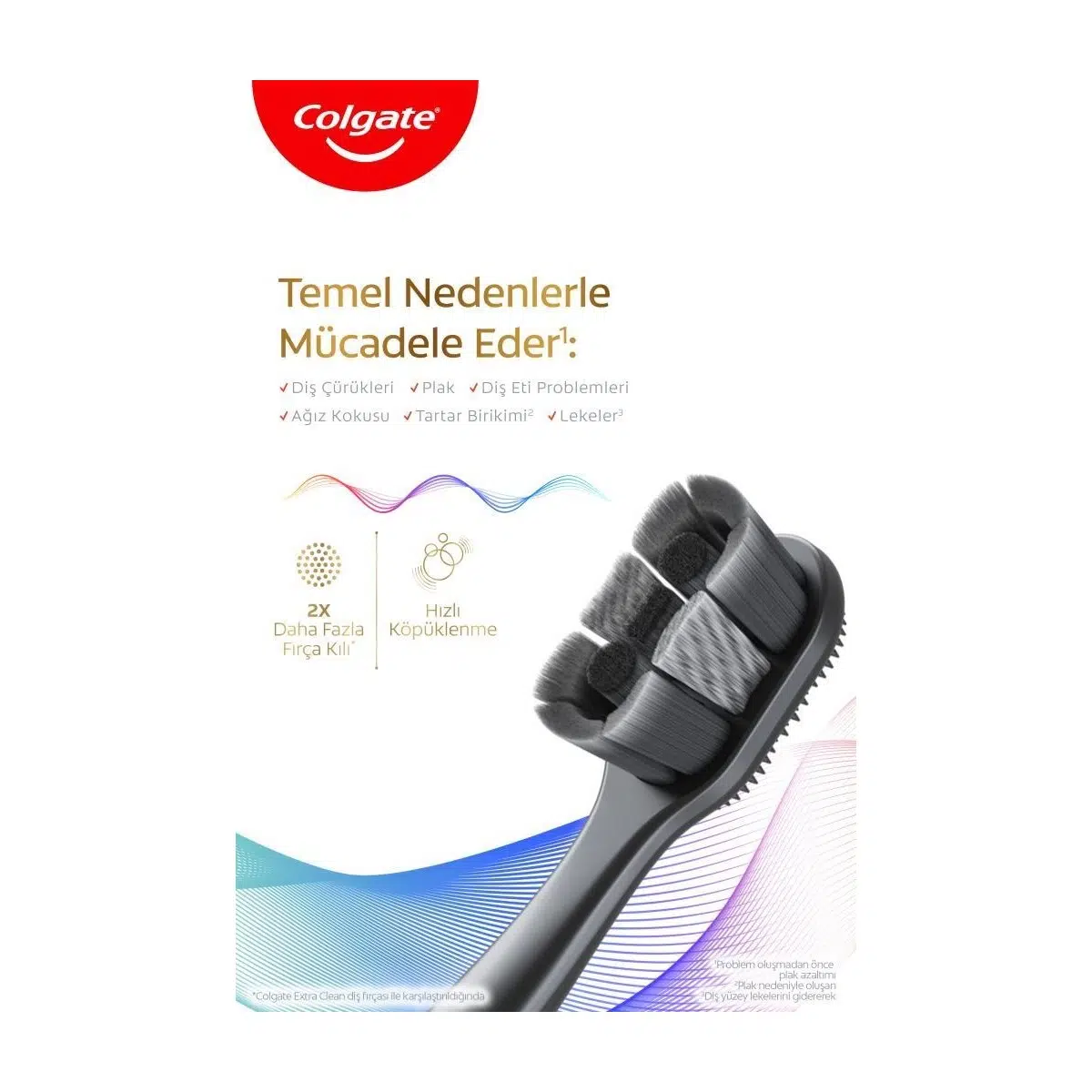 Colgate Total Aktif Koruma Beyazlık Diş Fırçası. Yetişkinler için. • Leke oluşumunu önlemek için yüzey lekelerini gidermeye yardımcı olur • Kömür katkılı spiral fırça kılları + 2 kat daha fazla fırça kılı • Diş eti çizgisi boyunca ve dişler arasındaki lekelere ulaşan ince uçlu fırça kılları • Diş macununun daha derinlere ulaşması için hızlı köpüklenme. Problemler oluşmadan önce plak azaltımı (günde 2 kez fırçalama ile). Plak nedeniyle oluşan diş yüzey lekelerini giderir.